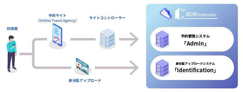 旅行・宿泊施設業界では、宿泊予約サイト(Online Travel Agent = OTA)からの予約を「サイトコントローラー」と呼ばれる予約一元管理システムに接続して、予約状況の管理や料金設定、在庫(空室)管理を行うのが一般的だ。リアテクノロジーズでは、そのサイトコントローラーからさらに自社開発の管理システム「Admin(現在は「Reboot」と改称)」に接続して、予約管理と売上状況を統合している。また、宿泊に伴い要求される身分証の画像データをアップロードするシステム(「Identification」と呼称)も存在している。